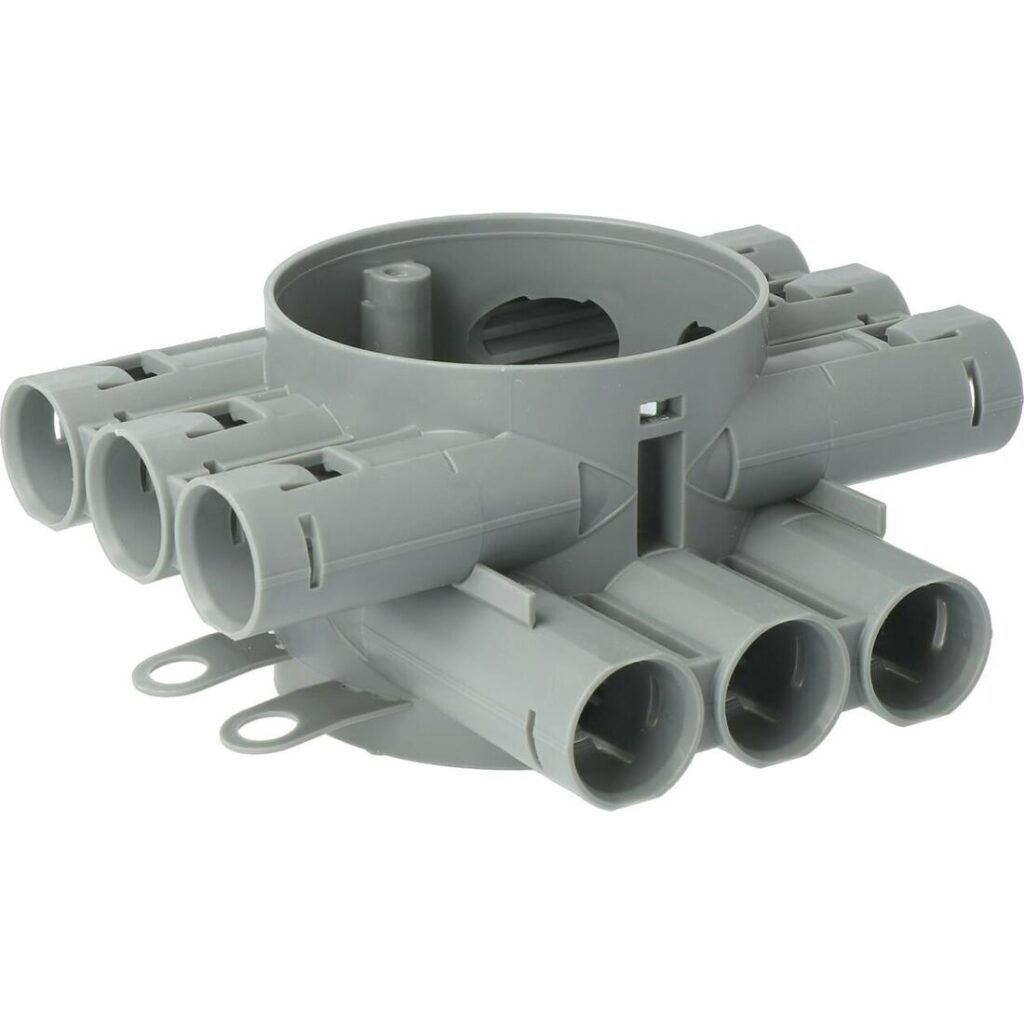 Door de tunnelspruiten sluit je buizen stevig en waterdicht aan op de centraaldoos. De IP20 beschermingsgraad maakt dit product geschikt voor droge binnenruimtes zoals woonkamers, kantoren en slaapkamers. De centraaldoos ondersteunt kabels tot 6 mm² en biedt buisvergrendeling voor een veilige bevestiging. Je kunt deze centraaldoos gebruiken zonder deksel of combineren met een apart verkrijgbaar deksel voor extra bescherming.
