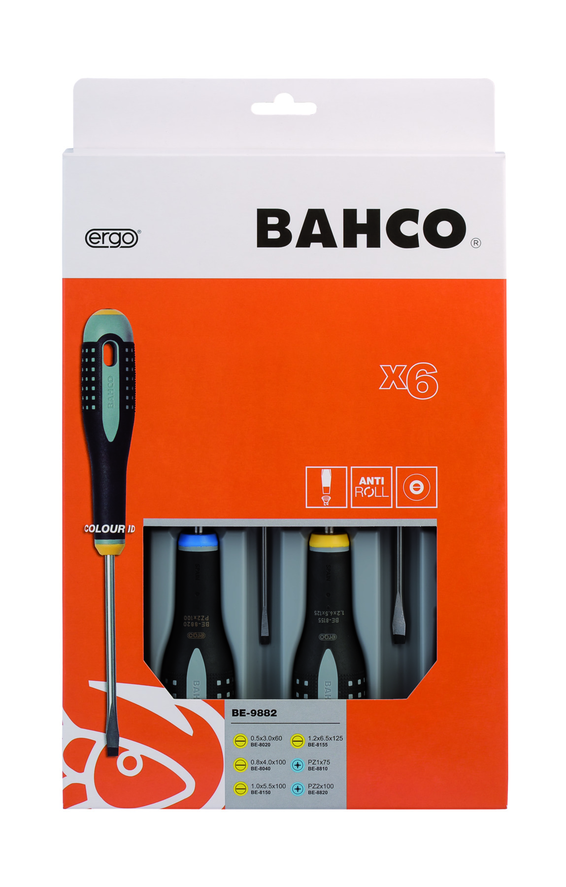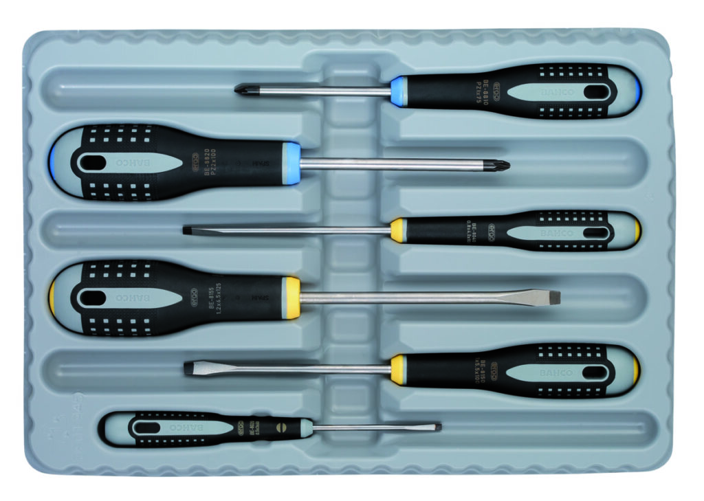 e schroevendraaierset BE9882 van Bahco is 6-delig. De set bevat schroevendraaiers voor zaagsnede- en Pozidrive schroeven, en wordt geleverd in een kartonnen doos.