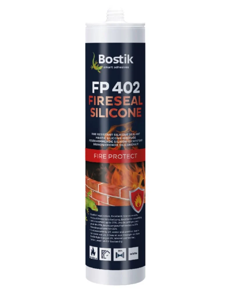De Fireseal Silicone van Bostik is een brandwerende siliconenkit die speciaal ontwikkeld is voor het brandwerend afdichten van aansluit- en bewegingsvoegen in constructies. De Bostik Fireseal Silicone voorkomt het verspreiden van vuur, giftige dampen en natuurlijk rook. In combinatie met de Bostik FP 404 PU Foam (brandwerende purschuim) kan de brandwerendheid worden opgeschaald naar 180 minuten in voegen van 40mm breed. De brandwerendheid van de FP 402 Firesealant Silicone is getest conform EN 1366-4.