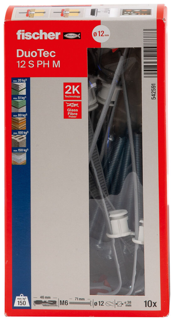 - Het glasvezelversterkte kunststof en de metalen insert (fischer DuoTec 12) zorgen voor de opname van hoge trek- en dwarskrachten in alle soorten plaatmateriaal.