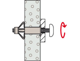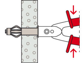 - De HM kan gemonteerd worden met een montagetang. Bij het gebruik van een accuschroevendraaier of schroevendraaier, dient u de voorgemonteerde schroef eerst te demonteren. Bij het inschroeven en het spreiden van de armen, dient het aanbouwdeel of plaatdikte van maximaal 6 mm geplaatst te worden gebruikt om meedraaien van de hollewandplug in het boorgat te voorkomen.