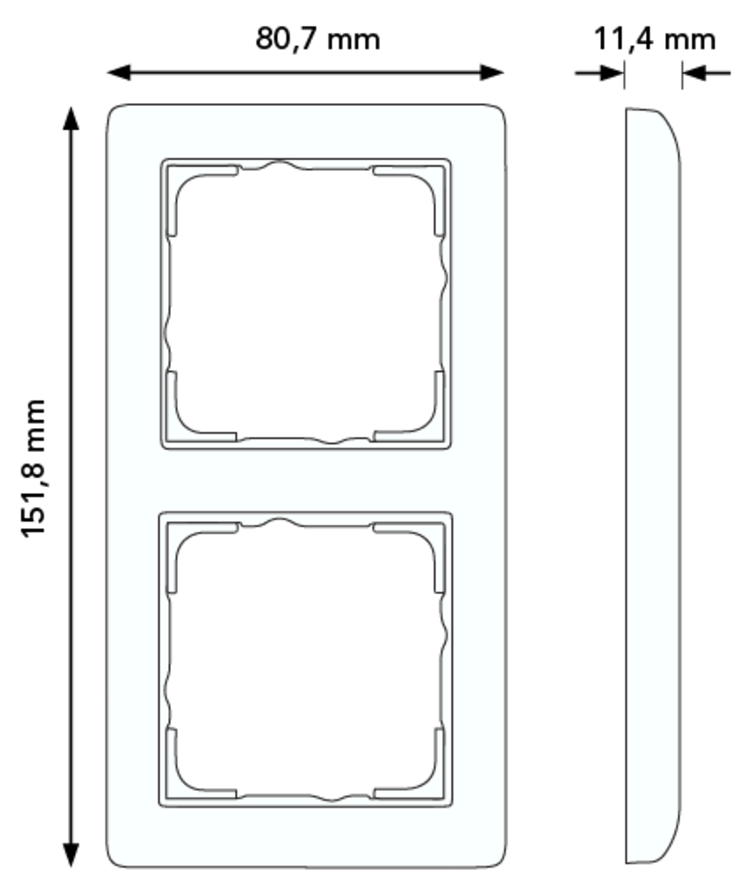 Tweevoudig afdekraam, geschikt voor verticale en horizontale montage. Afmetingen (buitenmaat bxhxd): 80,7 x 151,8 x 11,4 mm. Serie: Standaard 55, kleur: wit glans.