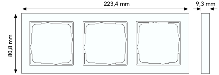 Drievoudig afdekraam, serie: E2, geschikt voor verticale en horizontale montage. Afmetingen (buitenmaat bxhxd): 80,8 x 223,4 x 9,3 mm. Afdekraam in combinatie met afdichtset ook geschikt voor installatie spatwaterdicht inbouw IP44.