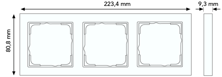 Drievoudig afdekraam, serie: E2, geschikt voor verticale en horizontale montage. Afmetingen (buitenmaat bxhxd): 80,8 x 223,4 x 9,3 mm. Afdekraam in combinatie met afdichtset ook geschikt voor installatie spatwaterdicht inbouw IP44.