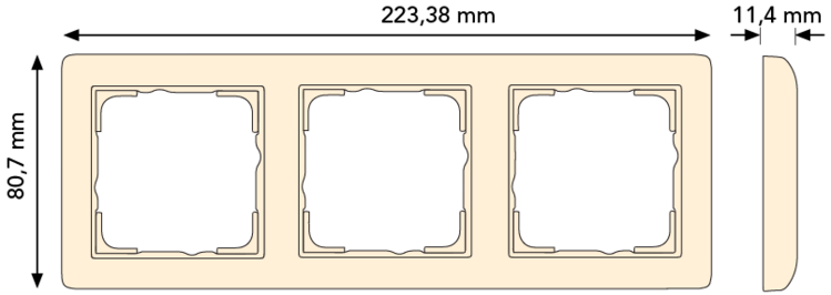 Drievoudig afdekraam, geschikt voor verticale en horizontale montage. Afmetingen (buitenmaat bxhxd): 80,7 x 223,3 x 11,4 mm. Serie: Standaard 55, kleur: crème glans.