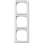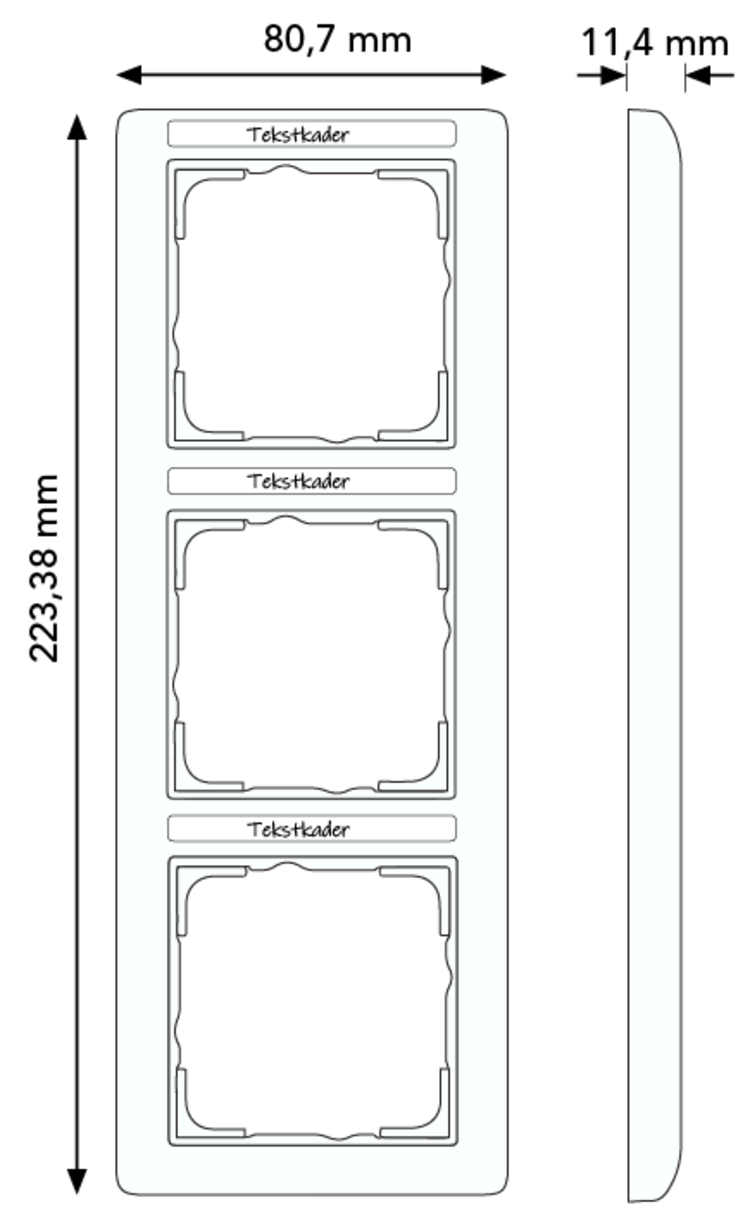 Drievoudig afdekraam met tekstkader, alleen geschikt voor verticale montage. Afmetingen (buitenmaat bxhxd): 80,7 x 223,3 x 11,4 mm. Serie: Standaard 55, kleur: wit glans.