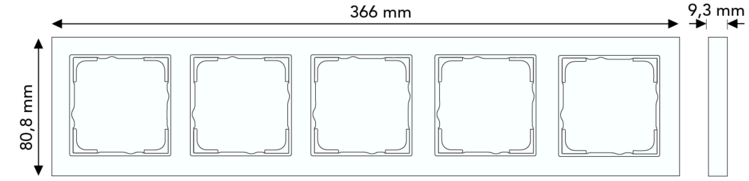 Vijfvoudig afdekraam, serie E2, geschikt voor verticale en horizontale montage. Afmetingen (buitenmaat bxhxd): 80,8 x 366,0 x 9,3 mm. Afdekraam in combinatie met afdichtset ook geschikt voor installatie spatwaterdicht inbouw IP44.