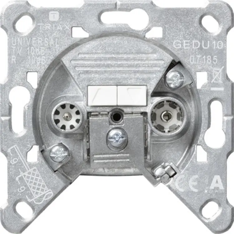 2-voudige doorvoercontactdoos met stekkertechnologie. IEC-stekker voor ultrakortegolf (radio) en DVB-T/T2. IEC-aansluiting voor DVB-S/S2 (SAT).