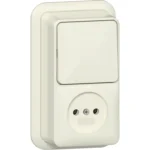 Opbouw combinatie schakelaar/wandcontactdoos, crème. Uitvoering schakelaar: wisselschakelaar. Uitvoering wandcontactdoos: zonder randaarde. Wordt geleverd met montageplaat en adapter K/P25 (voor een kabelgoot).