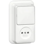 Opbouw combinatie schakelaar/wandcontactdoos, wit. Uitvoering schakelaar: wisselschakelaar. Uitvoering wandcontactdoos: zonder randaarde. Wordt geleverd met montageplaat en adapter K/P25 (voor een kabelgoot).