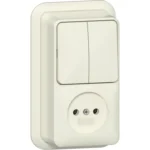 Opbouw combinatie schakelaar/stopcontact, crème. Uitvoering schakelaar: serieschakelaar. Uitvoering stopcontact: zonder randaarde. Wordt geleverd met montageplaat en adapter K/P25 (voor een kabelgoot).