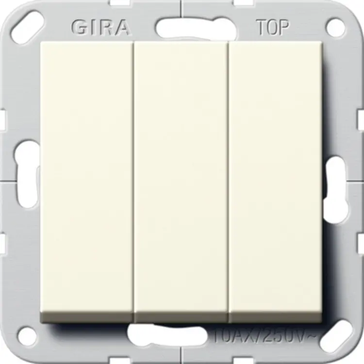 Gira Systeem 55 groepen drukcontact, kunststof, crème-wit/elektrowit, samenstelling basiselement met adapterp, bedieningswijze wip, contacten 3 maakcontact, 3 wippen, inbouw, kwaliteitsklasse thermoplast, halogeenvrij, oppervlaktebescherming geen (onbehandeld), RAL-nummer 1013,