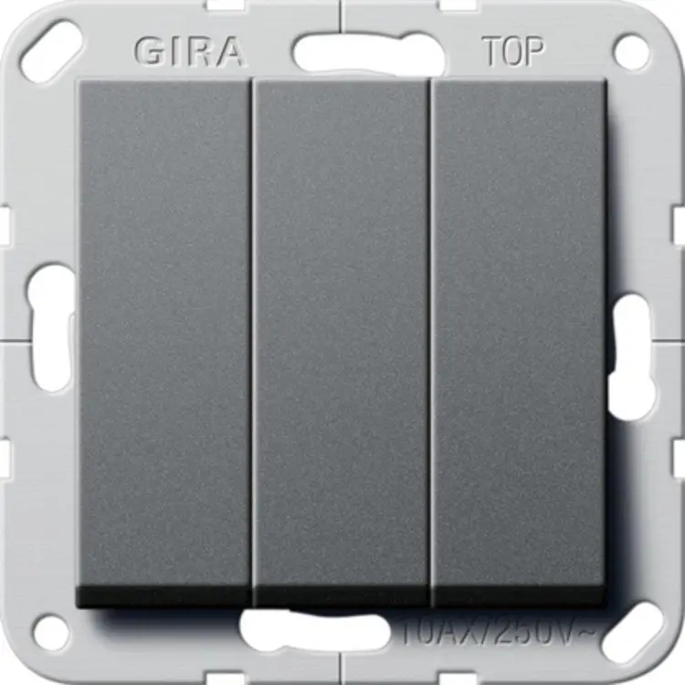 Gira Systeem 55 groepen drukcontact, kunststof, antraciet, samenstelling basiselement met adapterp, bedieningswijze wip, contacten 3 maakcontact, 3 wippen, inbouw, kwaliteitsklasse thermoplast, halogeenvrij, oppervlaktebescherming geen (onbehandeld), beschermingsgraad (IP) IP20, nom. spanning 250V,