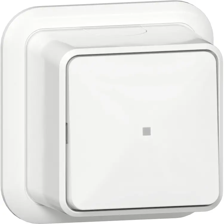 Opbouw 1-polig drukcontact (pulsdrukker) maakcontact, met apart meldcontact, 10A, IP20, wit. Wordt geleverd met montageplaat en adapter K/P25.