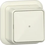 Opbouw 1-polig drukcontact (pulsdrukker) met wisselcontact en controlevenster, 10A, IP20, creme. Wordt geleverd met montageplaat en adapter K/P25 (voor een kabelgoot).