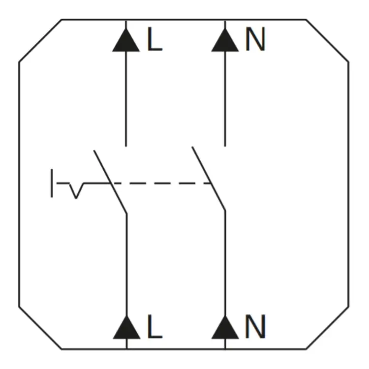 Tweepolige schakelaar voor schakelen van fase en nul. Toepassingen voor natte ruimtes zoals het schakelen van verlichting in een badkamer of buitenverlichting. Niet geschikt voor wisselschakelingen. De schakelaar kan worden gemonteerd in de inbouwdoos met schroefbevestiging (niet voorzien van bevestigingsklauwen/spreidklemmen). Bedrading aan te sluiten met steekklemmen. Afdekken met schakelwip en afdekraam.