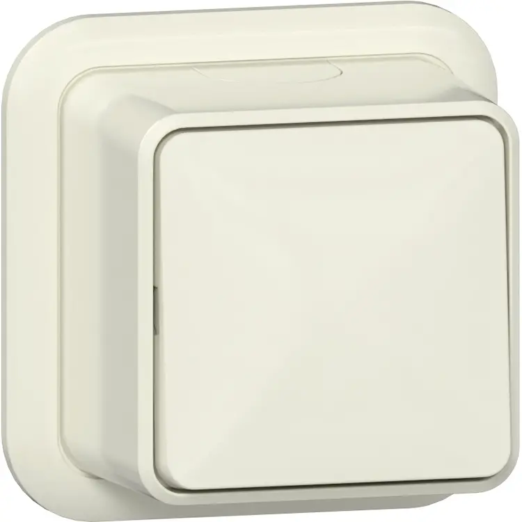 Opbouw tweepolige schakelaar, 10A, IP20, crème. Voor het schakelen van de fase en de nul, niet geschikt voor wisselschakeling. Voor het schakelen van verlichting in natte ruimtes zoals een badkamer of buitenverlichting. Wordt geleverd met montageplaat en adapter K/P25 (voor een kabelgoot).