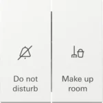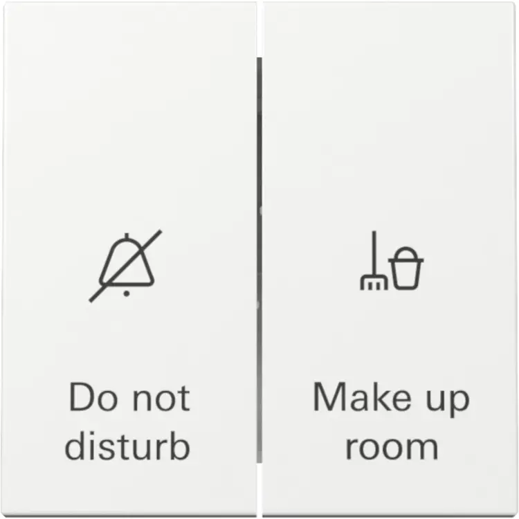 Tweevoudige schakelaar met opdruk “Do not disturb” en “Make up room”. Met vergrendeling tegen dubbelzijdig inschakelen. Voorzien van schakelwip, nog afdekken met een afdekraam. Serie: Systeem 55, kleur: wit glans.