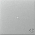 Enkelvoudige schakelwip (knop) met symbool ‘stekker’ en controlevenster. Geschikt voor enkele schakelaars, pulsdrukkers en drukvlakschakelaars met verlichting*. Serie: Systeem 55, kleur: aluminium mat.