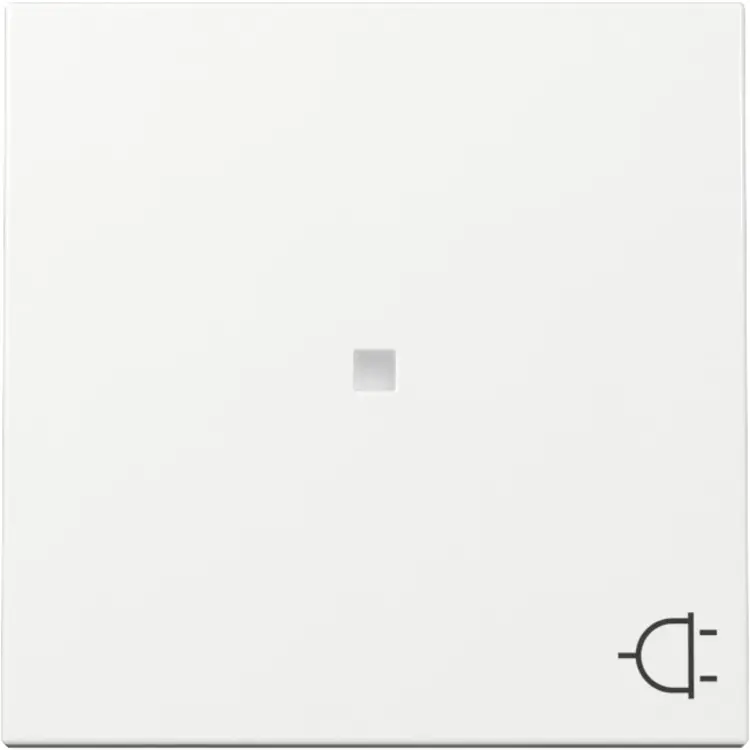Enkelvoudige schakelwip (knop) met symbool ‘stekker’ en controlevenster. Geschikt voor enkele schakelaars, pulsdrukkers en drukvlakschakelaars met verlichting*. Serie: Systeem 55, kleur: wit glans.