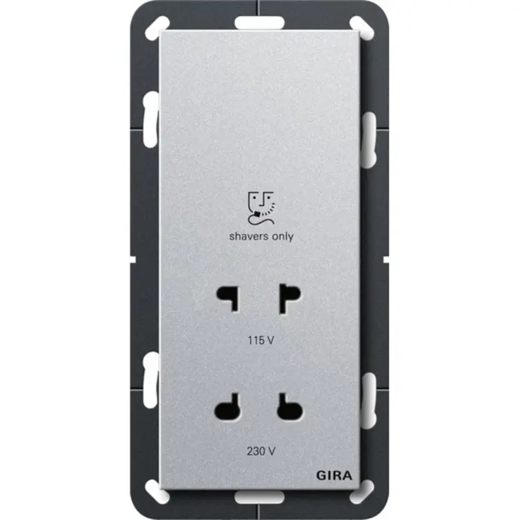 De Gira scheercontactdoos is een contactdoos voor het veilig opladen en gebruik van scheerapparaten in de badkamer. Deze moet worden geïnstalleerd met een speciale inbouwdoos (281900) en afgewerkt worden met een 2-voudig afdekraam zonder middenstijl.