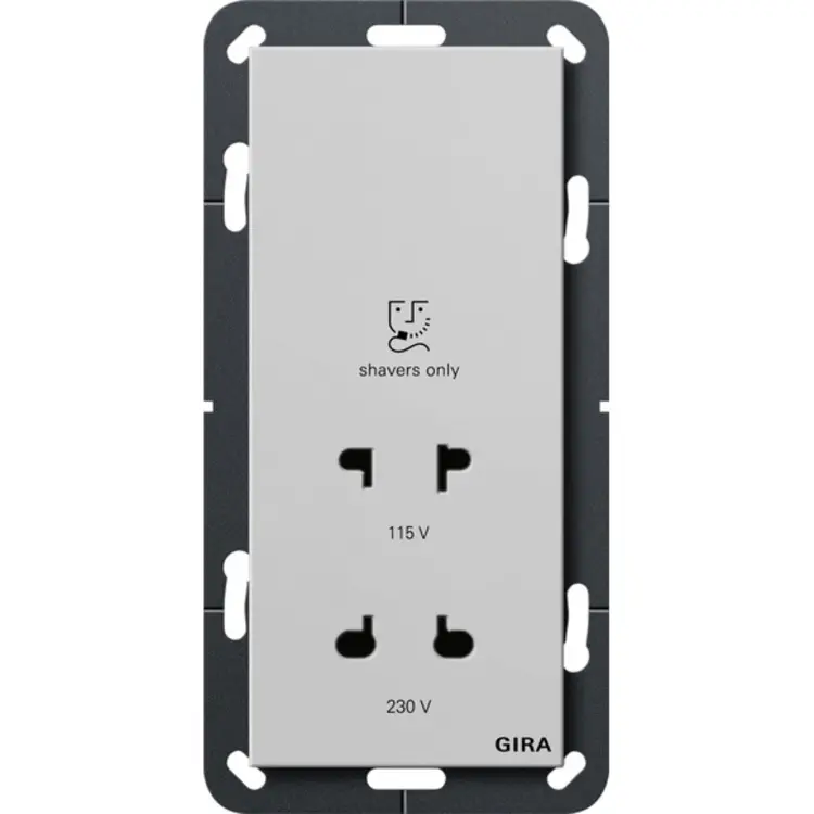 De Gira scheercontactdoos is een contactdoos voor het veilig opladen en gebruik van scheerapparaten in de badkamer. Deze moet worden geïnstalleerd met een speciale inbouwdoos (281900) en afgewerkt worden met een 2-voudig afdekraam zonder middenstijl.