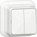 Opbouw serieschakelaar, 10A, IP20, wit. Voor het schakelen van twee afzonderlijke lichtpunten, niet geschikt voor hotelschakelingen. Wordt geleverd met montageplaat en adapter K/P25 (voor een kabelgoot).