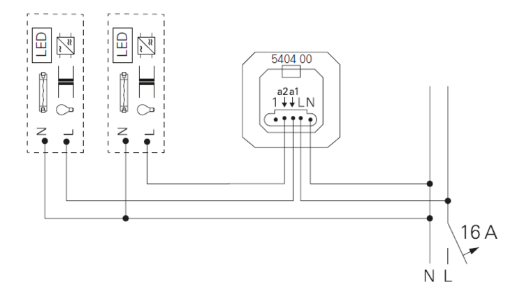 *Een 2-draads nevenaansluiting of impulsdrukker schakelt altijd beide uitgangen tegelijkertijd. Een draaidimmer-nevenaansluiting schakelt alleen uitgang a1. Een 3-draads nevenaansluiting met 2-voudig toetselement:Â schakelt beide uitgangen separaat (net als de hoofdaansluiting).
