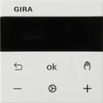 Systeem 3000 thermostaatknop met display en Bluetooth voor het handmatig en tijdgestuurd regelen van de kamertemperatuur. Bediening met knoppen of via de Gira app (BT). Exclusief basiselement (bijv. artikel 539500). Serie: Systeem 55, kleur: wit mat.