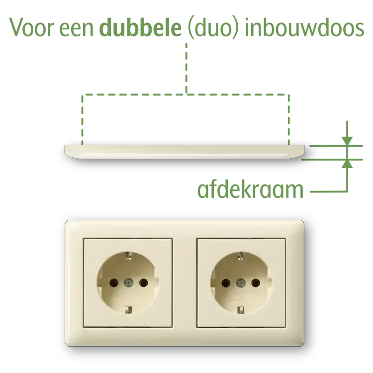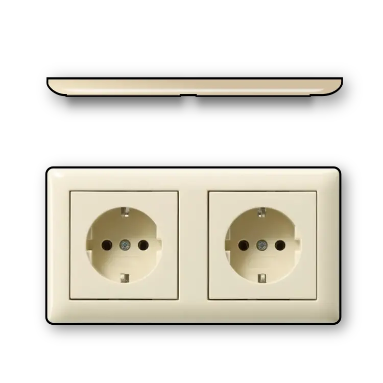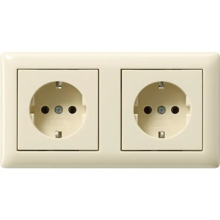 Dubbel stopcontact met randaarde, compleet met afdekraam. Voorbedraad; vormt één geheel, niet te splitsen. Past niet in twee enkele inbouwdozen, speciale duo inbouwdoos vereist. Systeem 55, crème glans.