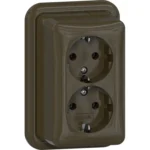 Dubbel opbouw stopcontact met randaarde. Kleur: bruin. Wordt geleverd met montageplaat en adapter K/P25 (voor een kabelgoot).Â