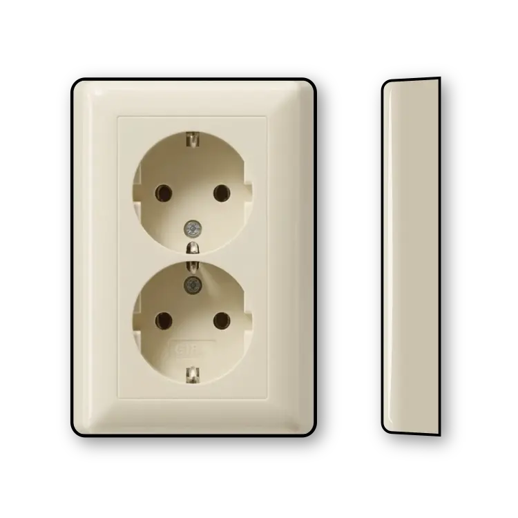 Dubbele wandcontactdoos met randaarde, geschikt voor een enkele (ronde) inbouwdoos. Serie: Standaard 55, kleur: crème glans. Zonder spreidklemmen (bevestigingsklauwen). Bedrading aansluiten met steekklemmen. Doordat deze dubbele wcd alleen geschikt is voor een enkele (ronde) inbouwdoos, ligt deze wat dikker op de muur. Dit wordt dan ook wel half-opbouw genoemd.