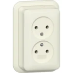 Dubbele opbouw wandcontactdoos zonder randaarde, crème. Wordt geleverd met montageplaat en adapter K/P25 (voor een kabelgoot).