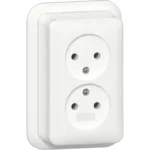 Dubbele opbouw wandcontactdoos zonder randaarde, wit. Wordt geleverd met montageplaat en adapter K/P25 (voor een kabelgoot).
