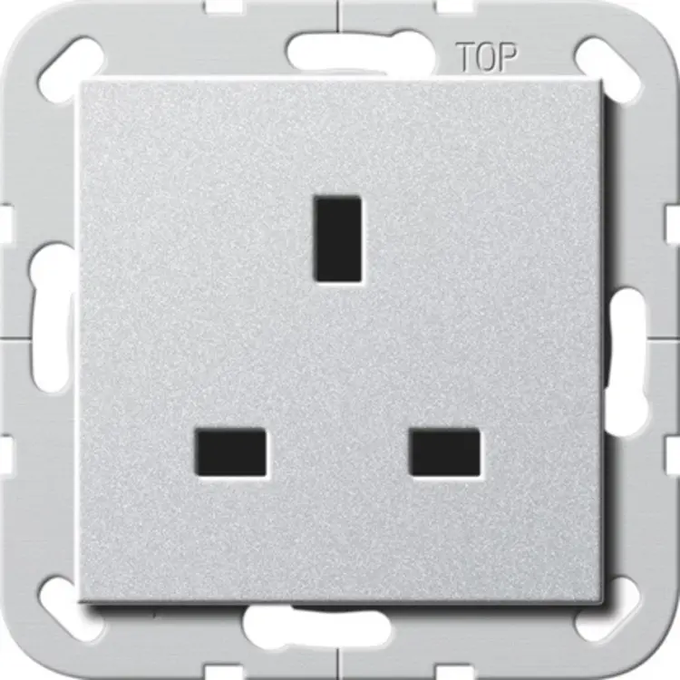 Gira Systeem 55 wandcontactdoos (wcd schakelmat.), kunststof, aluminium, inbouw, uitvoering british Standard, beschermingsgraad (IP) IP20, afdekking centraalplaat, aansluitwijze schroefklem, 1 eenheid, met verhoogde aanraakbeveiliging, slagvast, schakelmateriaalbreedte 55.45mm, halogeenvrij,