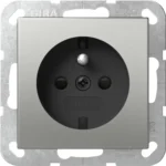 Stopcontact met penaarde (voor België) en verhoogde aanraakbeveiliging, Serie: Systeem 55, kleur: edelstaal. Bedrading bevestigen middels steekklemmen.
