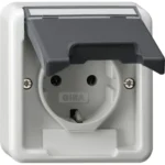 Gira wandcontactdoos met randaarde, klapdeksel en tekstkader. Opbouw IP44, moet gemonteerd worden op een bodemdeel (niet meegeleverd).