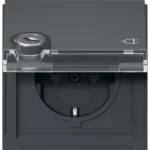 Gira stopcontact met randaarde, klapdeksel, tekstkader en slot, TX_44 antraciet. Er zijn twee sleutels bij levering inbegrepen en ook een blanco tekstlabel wordt meegeleverd.