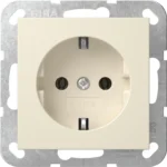 Stopcontact (schakelmateriaal), overig, creme glans, 1 eenheid, uitvoering randaarde, inbouw, afdekking centraalplaat. Met spreidklemmen.