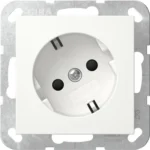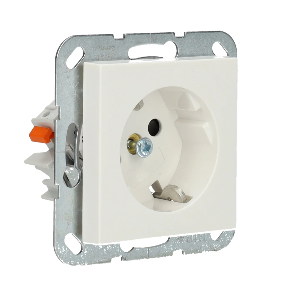 Stopcontact met randaarde, verhoogde aanraakbeveiliging en stekkerstand 30 graden gedraaid. Zonder spreidklemmen (bevestigingsklauwen). Serie: Systeem 55, kleur: wit mat.