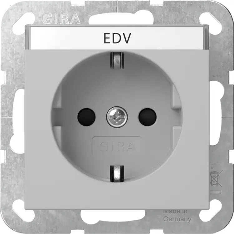 Gira stopcontact randaarde met verhoogde aanraakbeveiliging en tekstkader Systeem 55 grijs mat. Tekstlabel ‘EDV’ zit bij de levering inbegrepen.Â