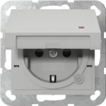 Stopcontact met randaarde, verhoogde aanraakbeveiliging, klapdeksel en controlelamp, Systeem 55, grijs mat. Een glimlampenelement wordt standaard meegeleverd.