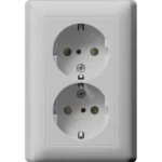 Dubbel stopcontact met randaarde, geschikt voor een enkele (ronde) inbouwdoos. Zonder spreidklemmen (bevestigingsklauwen). Kleur: grijs mat. Bedrading aansluiten met steekklemmen.Â