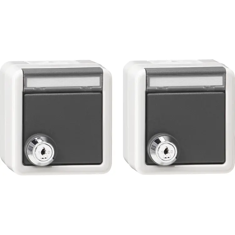 Set van twee wandcontactdozen met randaarde, voorzien van gelijksluitend slot, klapdeksel en tekstkader. Opbouw (onder en bovenstuk), IP44.