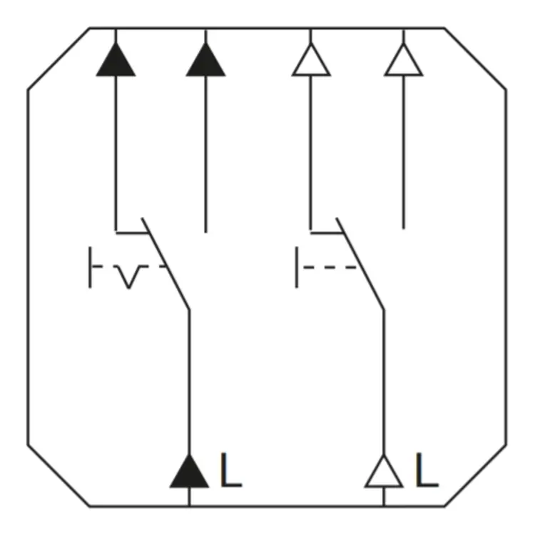 Combinatie van een gewone wisselschakelaar en een pulsdrukker. Ideaal voor situaties waarin niet bij beide contacten gebruik kan worden gemaakt van domotica. De linkerwip is een wisselschakelaar en de rechterwip is een drukcontact (pulsdrukker).