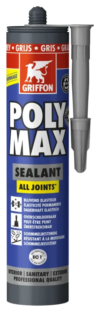 Griffon Poly Max® Sealant is een multifunctionele afdichtingskit van premium kwaliteit voor afdichtingstoepassingen binnen, buiten en in sanitaire ruimtes. Goede hechting op vele bouwmaterialen zoals beton, steen, composiet, metaal, keramische tegels, glas, (geverfd) hout en diverse kunststoffen.