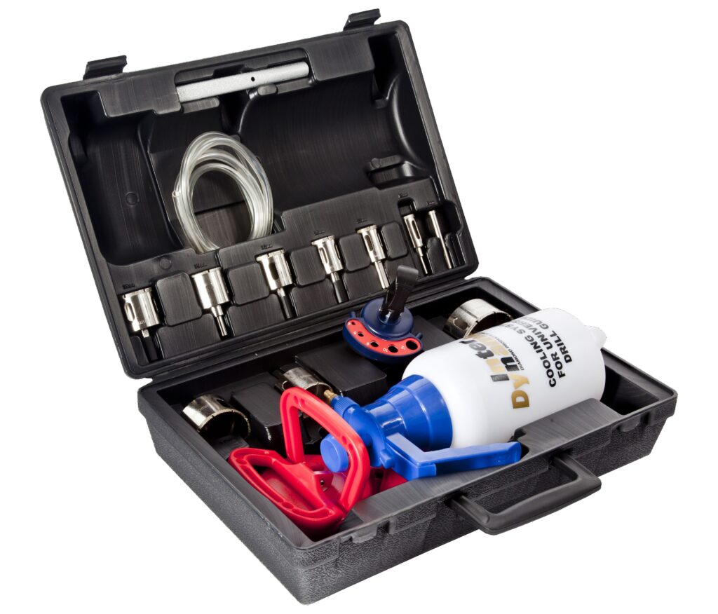 Voor het natboren met een handboormachine in alle tegels, ook extra harde zoals b.v. Gres Porcellenato. Set in kunststof koffer, inhoud: 10 diamantboren (8 – 73mm), boorgeleider met zuignap, boorgeleider kleine maten, watertoevoersysteem.