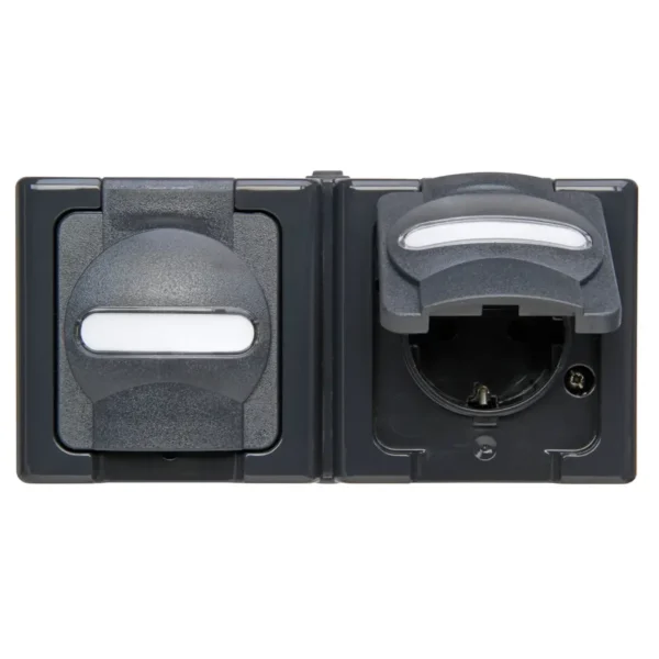 Kopp stopcontact 2-voudig met randaarde, voorbedraad, met klapdeksel IP44 spatwaterdicht verticaal – ProAQA zwart (947506003)