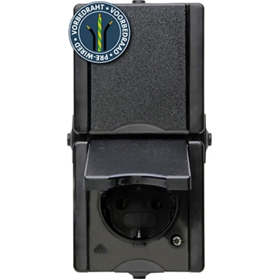 Kopp stopcontact 2-voudig met randaarde, voorbedraad, met klapdeksel IP44 spatwaterdicht verticaal – ProAQA zwart (947506003)