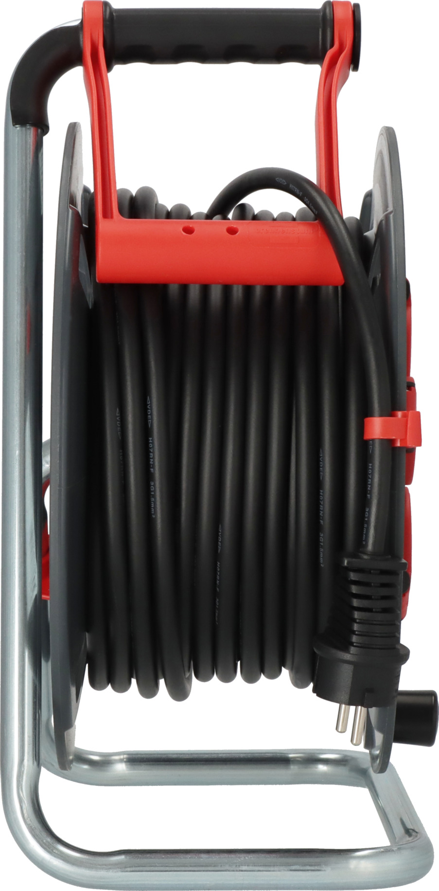 - De kabelhaspel van 25m is uitgerust met een (H07RN-F 3G1.5) RN-kabel, goedgekeurd voor moeilijke omstandigheden in gebouwen volgens VDE 0100 Deel 704 – de RN-kabel is zeer robuust, oliebestendig en bijzonder geschikt voor professioneel gebruik